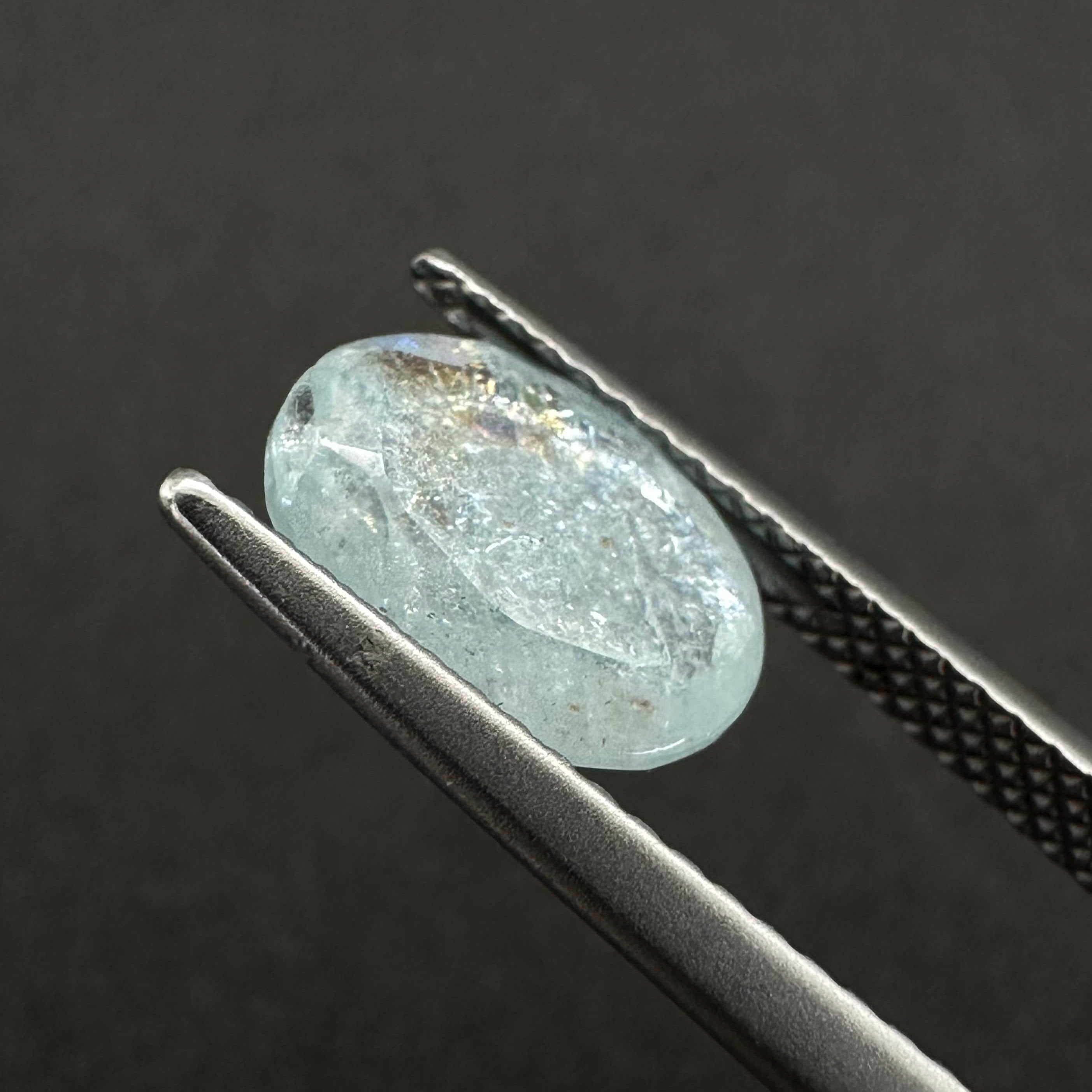 アクアマリンの中でも、内部の微細なインクルージョンが光を反射し、虹色の輝きを放つ希少な個体。